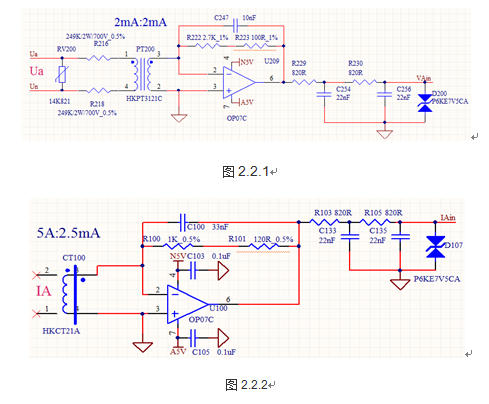 前端采樣電路如圖2.2.1和圖2.2.2所示,電壓電流采樣選用高精度電壓電流互感器,其體積小、精度高、全封閉、隔離耐壓能力強(qiáng)?;ジ衅鲗㈦妷弘娏鬓D(zhuǎn)換為小信號(hào)后,經(jīng)二階低通濾波送至AD芯片進(jìn)行轉(zhuǎn)換。AD芯片選用高精度16位AD芯片ADS8568SPMR,基準(zhǔn)電壓2.5V,8通道同步采樣,轉(zhuǎn)換速率滿足系統(tǒng)對(duì)快速采樣轉(zhuǎn)換的需求,且信噪比達(dá)到91.5dB。