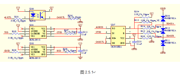 RS485通信接口采用高速光耦進(jìn)行隔離,穩(wěn)定通信波特率最高可達(dá)38.4K,并通過瞬態(tài)抑制二極管對(duì)接口做了過壓保護(hù),如圖2.5.1所示。