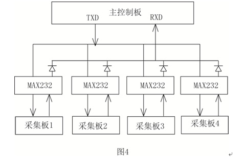 主控制板與采集板之間的通信電路采用主從總線拓?fù)浣Y(jié)構(gòu),以主控制板為主機(jī),采集板為從機(jī),每塊采集板的通信接口與RS232芯片連接,為防止輸出端電平相互影響,在從機(jī)的發(fā)送端和主機(jī)的接收端之間串入一個二極管。為保證機(jī)和從機(jī)正常的傳送數(shù)據(jù),需要有一套完整的信息傳輸模式,數(shù)據(jù)格式以及內(nèi)容的規(guī)約協(xié)議。主機(jī)向所有從機(jī)發(fā)送帶地址信息的指令報文,被尋址從機(jī)根據(jù)指令報文中功能碼做出應(yīng)答或動作,每個從機(jī)都有各自的獨(dú)立的地址,主機(jī)向從機(jī)發(fā)送的各種指令報文和從機(jī)所發(fā)的報文都是以從機(jī)的地址為開頭的,從機(jī)只讀取發(fā)給自己的指令,對以其它從機(jī)開頭的報文不做應(yīng)答。