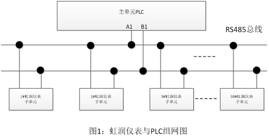 本文利用標(biāo)準(zhǔn)的MODBUS RTU通訊協(xié)議與 RS-485通信指令,方便的實(shí)現(xiàn)與多臺(tái)虹潤(rùn)NHR系列儀表的串行通信.成功的實(shí)現(xiàn)了用單臺(tái)控制器對(duì)多臺(tái)儀表的靈活控制??删幊炭刂破髟试S在一個(gè)RS-485通信接口上連接多達(dá)100臺(tái)虹潤(rùn)儀表,儀表大于60臺(tái)時(shí),需加一個(gè)RS-485中繼器,RS-485通信口通信距離長(zhǎng)達(dá)1KM以上。