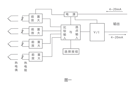 NHR-XTRM系列溫度遠(yuǎn)傳監(jiān)測儀是二線制多回路溫度變送器。它可接受多點(diǎn)熱電阻信號,并將各種生產(chǎn)過程中固體、液體、氣體的溫度顯示和 變送遠(yuǎn)傳。該儀表安裝在被測對象附近,用屏蔽電纜將各回路的熱電阻的測溫信號連至該 儀表各自獨(dú)立的前置放大器,前置放大器將微弱變化信號放大處理,輸送到比較輸入電路(選擇高溫信號)或選點(diǎn)輸入電路,進(jìn)行信號選擇。被選中的回路信號,再經(jīng)過電壓/電流轉(zhuǎn)換單元處理,將前置放大器的輸出電壓轉(zhuǎn)換成DC 4~20mA電流信號輸出。如選擇測溫范圍0~150℃則對應(yīng)DC 4~20mA輸出。 具體原理見圖一所示。