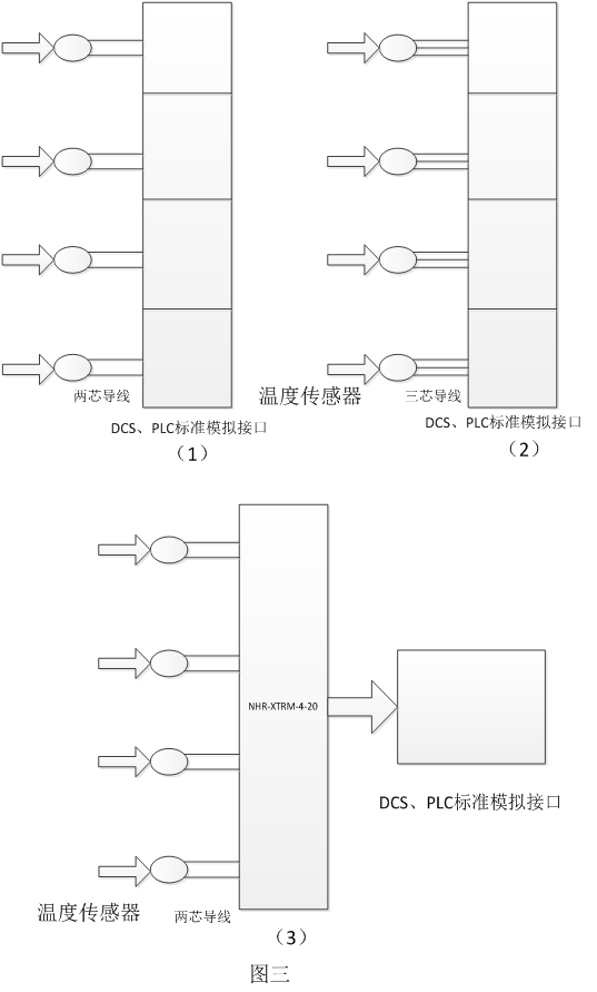 方案二:如圖三(2)所示,每個熱電阻傳感器分別用三芯屏蔽電纜引至計算機(jī)熱電阻接口,在中央控制室監(jiān)控。